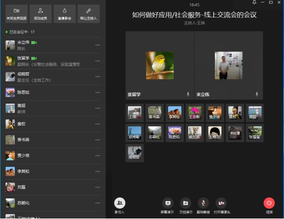 5月8日,WilliamHill官网就如何做好社会服务工作进行了动员和经验交流,米立伟院长主持召开本次会议,张留学副院长、王志新副主任出席会议,苏朝化教授、黄权教授等近二十位中青年骨干教师参加会议,本次会议通过企业微信以线上会议方式进行。