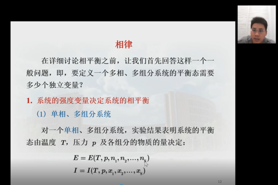 《物理化学》课上,熊加斌老师运用企业微信直播的形式讲解相图及相律,采用PPT演示模式,学生进行连麦问答,并及时评论讨论。
