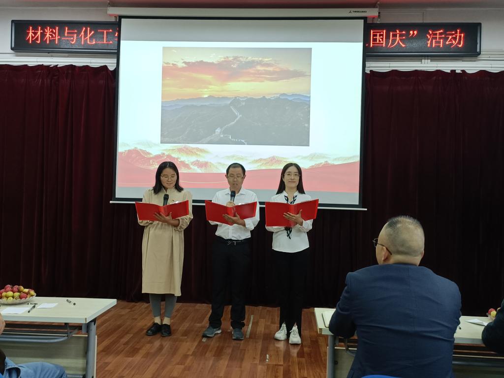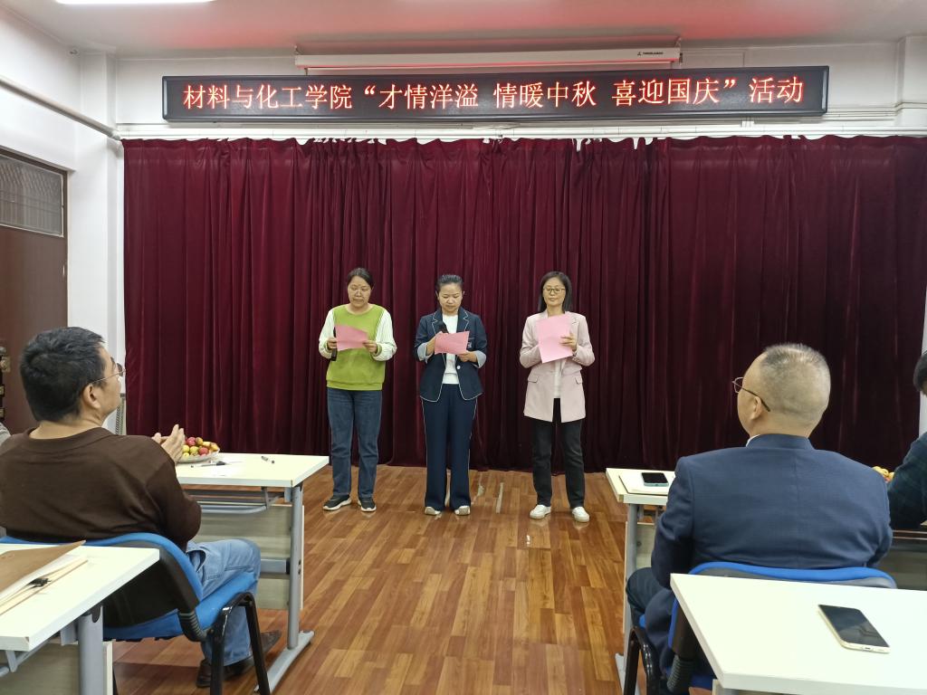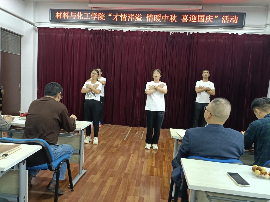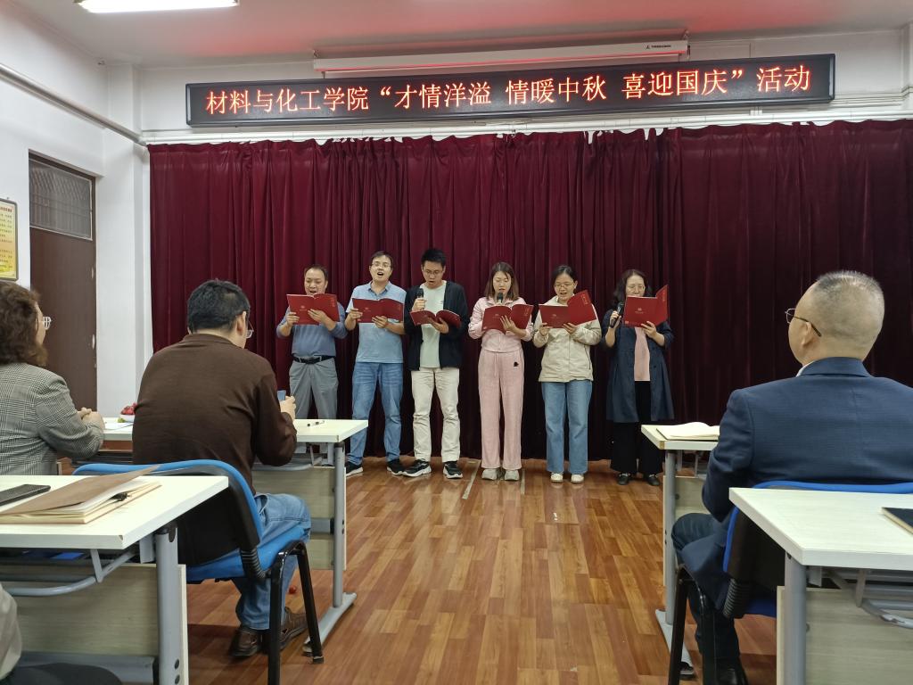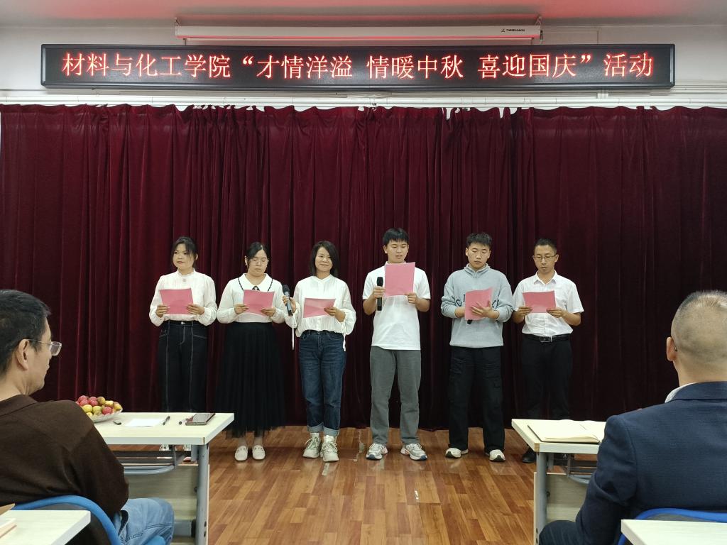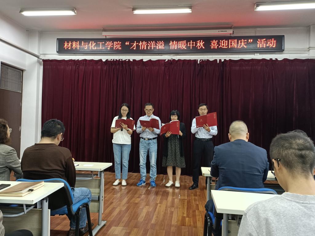 国庆将至,中秋即来。九月丹桂飘香,双节悄然而至。国庆是举国欢庆的重要节日,中秋是阖家团圆的传统佳节。在国庆节与中秋节“双节”来临之际,为庆祝“双节”,9月26日,材料与化工学院组织开展了主题为“才情洋溢 情暖中秋 喜迎国庆”的歌唱及诗歌朗诵比赛活动。学院全体教职员工参加此次活动,学校机关党委、教务处、科技处等部门的材化大家庭成员应邀参加活动。活动由学院孙俊哲老师主持。