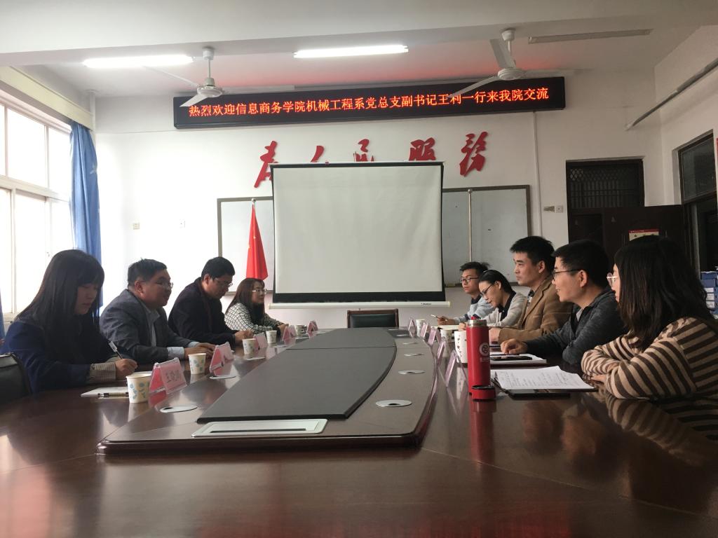 11月1日下午,信息商务学院机械工程系党总支副书记王利一行4人来WilliamHill官网交流考察,并在WilliamHill官网会议室召开座谈会。WilliamHill官网党委副书记周华强,学工办主任邢军阳,辅导员洪潇、艾文英、马向立等人参加了会议,会议由邢军阳主持。