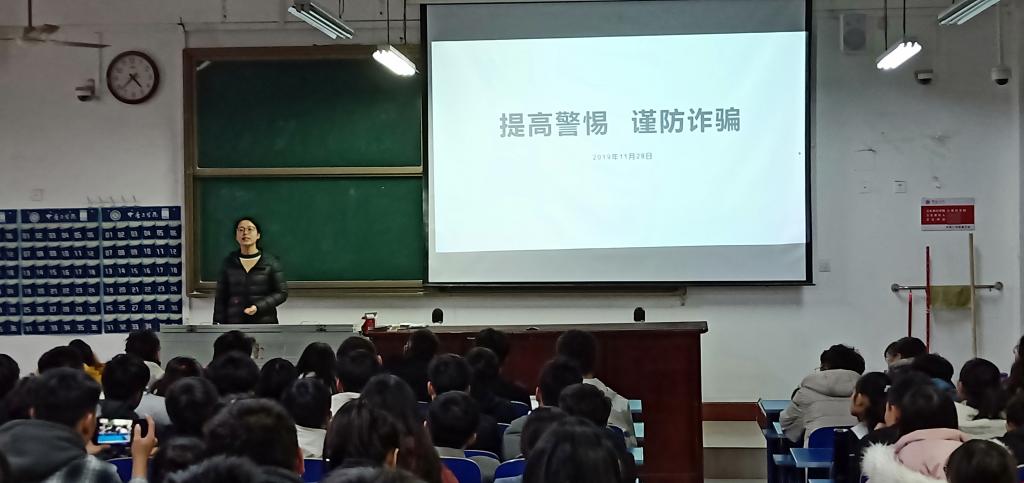 为帮助学生正确识别、防范诈骗,引导学生树立正确的安全观、消费观,培养学生艰苦朴素的精神,材化学院于2019年11月28日下午,在3号教学楼110教室,分别召开两场以“提高警惕 谨防诈骗”为主题的宣传教育活动,材化学院19级辅导员张皖豫主讲。