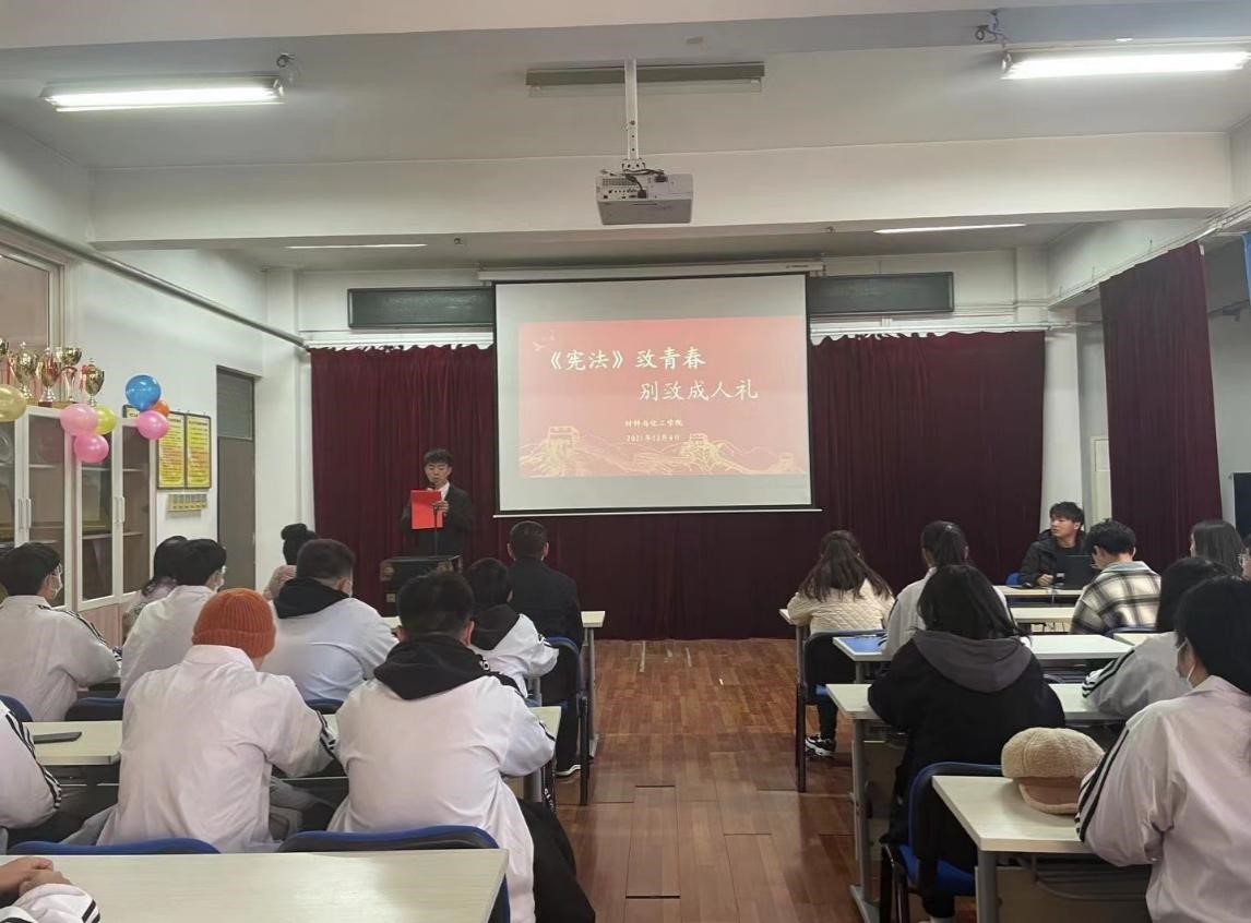 2021年12月4日是第八个国家宪法日,也是第四个“宪法宣传周”即将收官的重要节点。在这个具有特殊纪念意义的日子里,材料与化工学院在2号实验楼543开展“学宪法 致青春 别致成人礼”主题教育活动,加强宪法教育,普及宪法知识,弘扬宪法精神,同时,借此机会举行了21级学生成人礼仪式。学院党委书记李长林、副书记熊瑛、学工办主任刘瀚、副科级组织员洪潇及班主任邵志超老师参加本次活动。