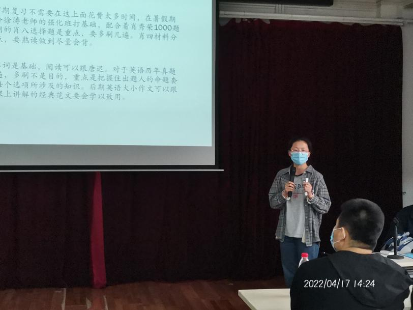 会议伊始,18级班主任贾旭发言,他对同学们考研成功表示祝贺,并希望19级同学能珍惜此次机会,认真聆听,充分交流;随后,18级考研上岸学生介绍考研经验,现场为同学们答疑解惑;最后,19级班主任熊加斌、陈思如两位老师进行总结发言。