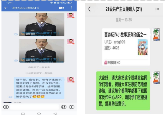 立足国家安全时代背景,提升学生金融安全意识。学院充分发挥班级微信群方便快捷的优势,向学生推送趣味防诈骗安全教育视频。各年级通过“视频+文字”喜闻乐见的视频内容宣传,增强同学们防诈骗教育的接受度,提高其防诈骗意识。同时提醒学生及时下载安装国家反诈中心APP,杜绝电信诈骗事件发生。