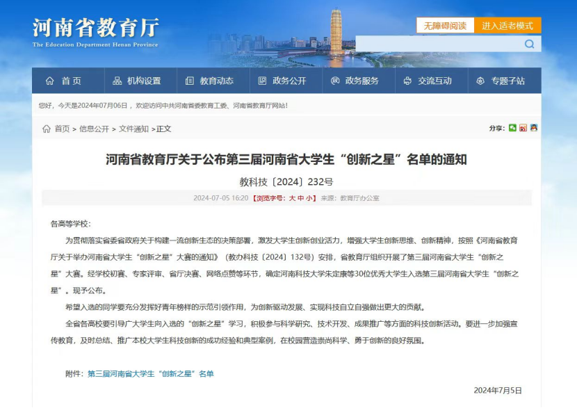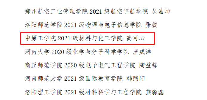 近日,河南省教育厅正式公布了第三届河南省大学生“创新之星”名单。经学校初赛、专家评审、省厅初赛、网络点赞等环节,WilliamHill官网2021级应用化学专业本科生高可心同学成功入选。