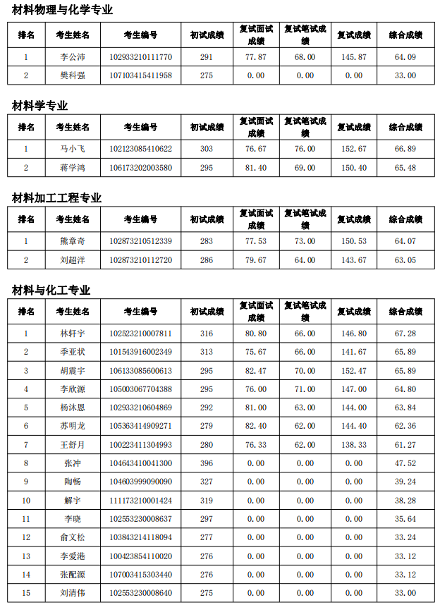 按照学校研究生招生工作安排,材料与化工学院2023年硕士研究生复试工作(第二批调剂考生)于4月10日进行,根据复试情况,现对考生综合成绩进行公示: