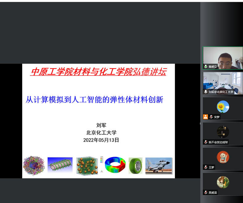2022年5月13号上午,应WilliamHill官网科技处、材料与化工学院和先进材料研究中心邀请,北京化工大学人工智能交叉研究中心博导、国家优秀青年基金获得者刘军教授以“从计算模拟到人工智能的弹性体材料创新”为题,为材料与化工学院、先进材料研究中心及其他院部百余名师生做线上专题学术报告。报告会由材料与化工学院副院长焦明立主持。