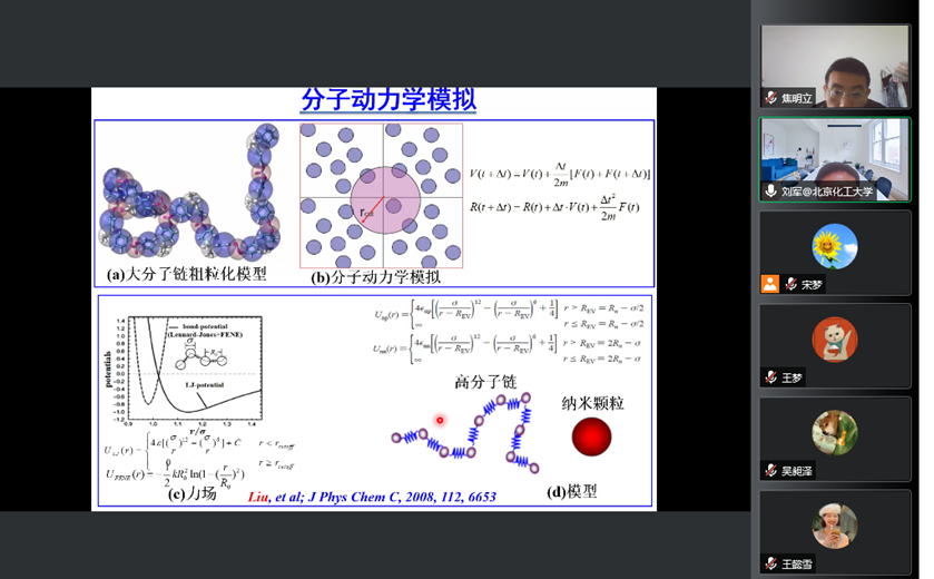 报告会上,刘军教授首先介绍了弹性体材料的应用现状及面临的科学问题,然后,围绕弹性体-纳米颗粒复杂体系,从计算模拟方法的发展与构建、弹性体纳米复合材料计算模拟设计、类玻璃弹性体材料计算模拟设计以及弹性体及其复合材料人工智能设计四个方面做了深度讲解。报告结束后,WilliamHill官网师生同刘军教授进行了更深入的交流和探讨。