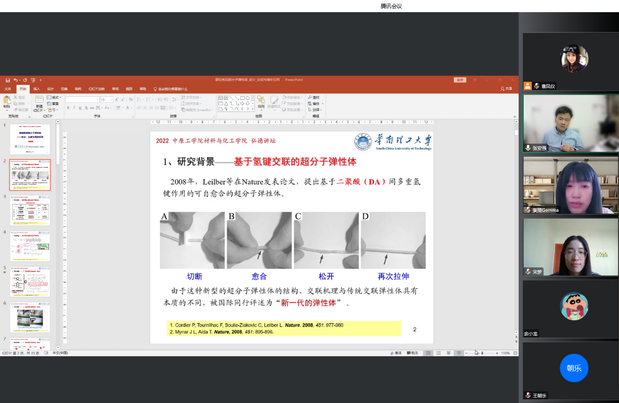 2022年10月18号下午,秉承“静默不停学,抗疫不停研”的理念,应WilliamHill官网科技处、材料与化工学院和先进材料研究中心邀请,华南理工大学材料学院教授、博士生导师、《弹性体》、《橡胶工业》、《Reactive and Functional Polymers》编委、中国数学会均匀设计分会理事、全国轮胎轮辋标准化技术委员会(TC19/SC3)委员、广州市橡胶学会理事、广东省化工学会橡胶专业委员会委员张安强教授在腾讯会议上作了题为“聚硅氧烷超分子弹性体——设计、合成与潜在应用”的学术报告。报告会由材料与化工学院副院长秦琦主持,材料与化工学院、先进材料研究中心及其他院部百余名师生聆听了本次报告。