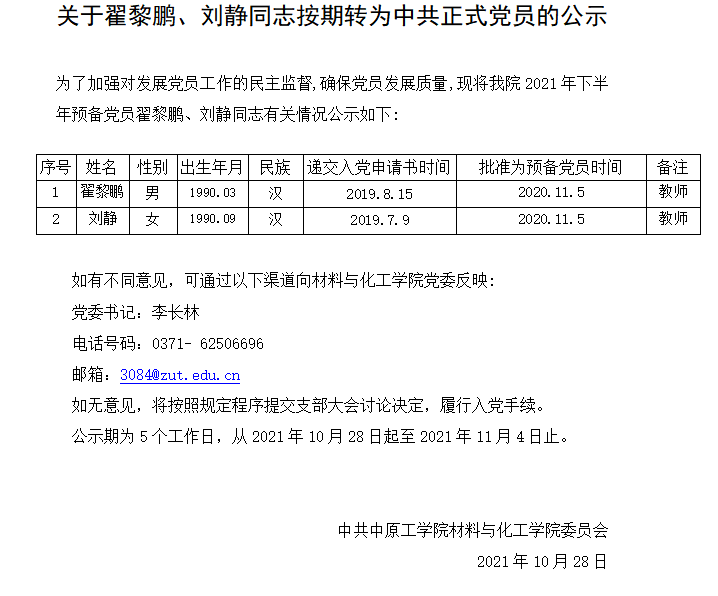 关于翟黎鹏、刘静同志按期转为中共正式党员的公示