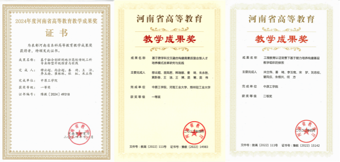 1. 穆云超,尚会超,秦琦,王洁,李玉南,崔林林,杜虹,米立伟.基于融合创新的地方高校传统工科专业转型升级探索与实践,河南省高等教育教学成果奖一等奖,2024.11.