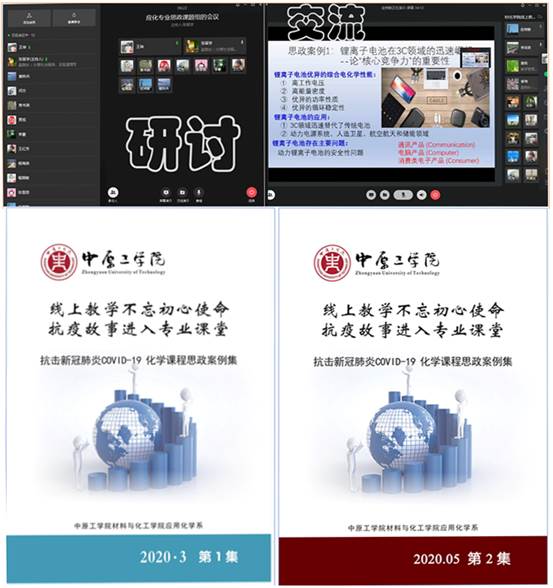 突如其来的新冠肺炎疫情打乱了新学期正常的教学计划,材料与化工学院应用化学系教工在校党委的坚强领导下,停课不停教、停课不停学,在进行线上教学的同时不忘初心、牢记使命,更加自觉增强教书育人的使命感责任感,按照学校党委、行政的安排部署,结合本专业的优势及讲授课程的特点,充分提炼挖掘,收集素材,把抗疫斗争的感人事迹融入线上教学,形成图文并茂的线上课程思政优秀案例。应化专业课程思政教研团队通过多次视频会议交流思路、互通资料、分享案例、畅谈心得,在线上教学活动中与学生互动实践,制作编写了“线上教学不忘初心使命,抗疫故事进入专业课堂”抗击新冠肺炎COVID-19化学课程思政案例集(第1集、第2集),案例集包括“柔肩担重任,危难显芳华—样本采集与核酸检测”、“小身材‘传’出大数据,高科技‘感’知护平安—传感器,活跃在新冠疫情战场上的隐身英雄”、“阻断病毒传播路,护佑健康你我他”、“新冠战‘疫’一线防疫机器人的动力担当-锂离子电池”及“没有从天而降的英雄,只有挺身而出的凡人”等共20个案例。案例集通过致力于将鲜活的抗疫故事融入专业课程,形成专业课程的“思政”切入点,发挥专业课“润物细无声”的育人作用,实现“思政”价值观要求向专业教育语言体系的转化。