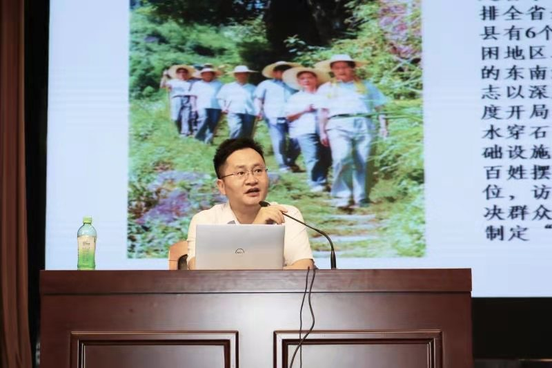 跟随习近平总书记的成长经历,米院长带领大家回忆了习近平总书记在基层的工作经历,生动讲述了习近平总书记提出的关于调查研究的“四下基层制度”、关于脱贫攻坚的“弱鸟先飞”理念和“滴水穿石”精神、关于招揽贤士的“人才九条”等攻坚克难的故事。进万家门,知万家情,解万家忧,办万家事,习近平总书记时刻以人民为中心,带动百姓摆脱贫困,务实担当,干在实处、走在前列,习近平总书记身上继承和展现出的马克思主义政治家的笃定信仰、远见卓识、历史担当,正是我们的精神旗帜,是坚定我们信仰信念的领航灯塔,指引我们永远跟着党,将革命进行到底。随后,米院长再次向大家讲解了习近平总书记的人才观—聚天下英才而用之,中国的未来属于青年,中华民族的未来也属于青年,实现中华民族伟大复兴的中国梦,需要一代又一代的有志青年接续奋斗。并提出,广大青年教师和学生应该紧密团结在以习近平同志为核心的党中央周围,坚定理想信念,志存高远,脚踏实地,勇做时代的弄潮儿,一定能够担当起党和人民赋予的历史重任,在实现中国梦的生动实践中放飞青春梦想,在为人民利益的不懈奋斗中书写人生华章。米院长告诉同学们,要切实把总书记为我们创造的宝贵思想财富、精神财富和实践成果学习好、传承好、贯彻好,增强“四个意识”、坚定“四个自信”、做到“两个维护”,做到政治自觉、思想自觉、行动自觉,切实让初心和使命在内心深处铸牢、在思想深处扎根。