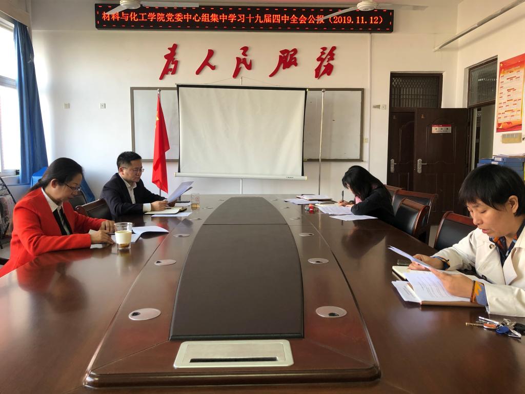 11月12日,材料与化工学院召开党委理论中心组第七次集中学习会议,学习党的十九届四中全会精神。学院党委书记杨佩主持会议并。她指出,要把学习宣传贯彻党的十九届四中全会精神作为当前和今后一个时期的重大政治任务,及时进行传达、深入学习领会、坚决贯彻落实。