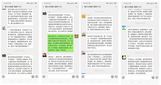 教工三支部在支部书记刘国群带领下集体观看了《榜样4》,并在微信群中进行了讨论,并发表了自己的想法。刘国群老师认为,驻村第一书记黄文秀同志研究生毕业后放弃在大城市工作的机会,回到家乡担任第一书记,非常值得尊敬,我们也要引导我们的学生扎根中国大地工作,服务国家,服务人民,服务中国特色社会主义事业。